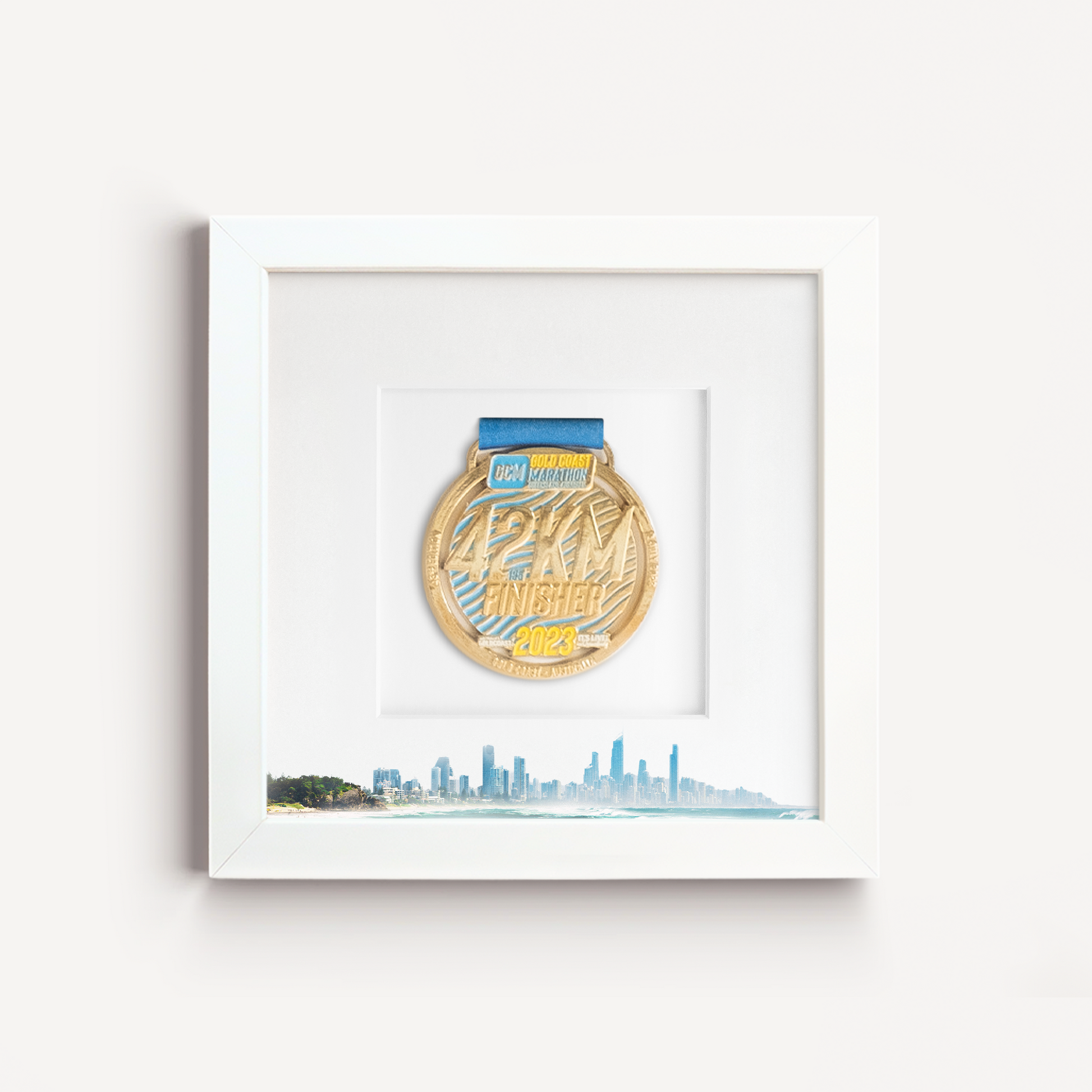 The perfect medal display frame for athletes who have competed in the Gold Coast Marathon as well as other major Gold Coast-based events such as the GC30, GC50 and the Gold Coast T100 Series.